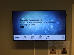 Infoskjermen kan vise våre oppslag på Elevpulsen, Foreldrepulsen, Grubleoppgave og Sitat. I tillegg så virker kalenderoppslaget til vår kalender utmerket (Merkedager, Flggdager, viktige hendelser i grunnskolen m.m.)